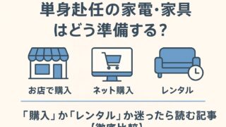 単身赴任が決まると、まず悩むのが 家電・家具の準備。 冷蔵庫・洗濯機・電子レンジ・ベッド・テーブルなど、揃えるものが多く「購入とレンタルどっちがいい?」と迷う人も多いはずです。 この記事では、単身赴任でよく利用される以下の3つの方法を徹底比...